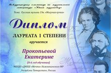 Поздравляем победительницу Международной олимпиады по музыкальной литературе « Юный музыковед». Тема: Русская музыка 19в. Могучая кучка» Прокопьеву Екатерину, 8 кл,-она стала Лауреатом Iстепени ,преподаватель Кушинская Светлана Николаевна.