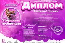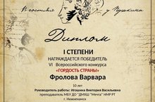 Дипломом I степени награждена Фролова Варвара, преподаватель Игошина Виктория Васильевна , они участвовали в VI Всероссийском конкурсе « Гордость страны».