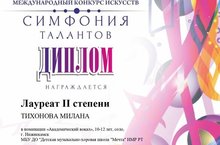 В Международном конкурсе искусств «СИМФОНИЯ ТАЛАНТОВ», в котором приняли участие конкурсанты из разных городов России. Мы рады поздравить нашу ученицу с прекрасным результатом. Лауреат II степени стала Тихонова Милана, преподаватель Игошина Виктория Васильевна, концертмейстер Нырова Антонина Викторовна