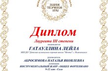 Завершился III Республиканский конкурс исполнителей по курсу фортепиано для учащихся разных специальностей ДМШ, ДШИ и студентов ССУЗов « FortePiano», конкурс проходил в Камских Полянах, от души поздравляем Гатауллину Лейлу, диплом Лауреата II степени и Давкаеву Аиду, Дипломант I степени,преподавателя по фортепиано Абросимову Наталью Яковлевну.Была сильнейшая конкуренция, конкурсанты были из Казани, из Набережных Челнов. Наши воспитанники показали отличный результат.Гордимся и поздравляем.