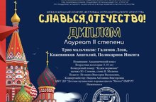 Поздравляем Долгова Даниила и трио мальчиков (Кожевникова Анатолия, Поликарпова Никиту и Галимова Леона) и преподавателя по вокалу Игошину Викторию Васильевну , концертмейстера Нырову Антонину Викторовну с победой в Международном конкурсе-фестивале исполнительского искусства «Славься, Отечество!», они стали Лауреатами II степени!!! Превосходно!