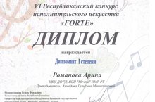 Завершился VI республиканский конкурс исполнительского искусства " Forte", конкурс проходил в Казани. От души поздравляем Романову Арину и ее педагога по фортепиано Ахмедову Гульсину Миннехановну.