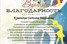 От души поздравляем преподавателя Кушинскую С.Н. и ее воспитанницу Никитину В. с очередной победой в Международном конкурсе искусств "Вдохновение", Виктория стала лауреатом 2 степени в номинации "Общее фортепиано", а Ахмедову Г.М. и ее воспитанниц -Сафиуллину Марину,она стала Лауреатом 1 степени, и Кувшинову Варвару, она стала лауреатом 2 степени, в этом же конкурсе, но в номинации "Академический вокал".