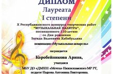 Поздравляем победителей X Республиканского конкурса творческих работ "Музыкальная палитра", посвященного 110-летию со дня рождения З.В.Хабабуллина- лауреат I степени-Арина Коробейникова, 1 кл, лауреат III степени Закирова Эльвина, 5 кл., Дипломант I степени Егорова Анастасия, дипломант III степени Афанасьева Дарья, преподаватель Нырова Антонина Викторовна. Так держать! Гордимся