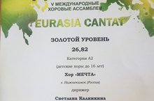 Золото наше! Диплом золотого уровня!!!!!! Гордимся!!! Ура!!!! V Международный хоровой конкурс-фестиваль «EURASIA CANTAT”-2019,который проходил в г. Екатеринбург со 2-7 мая 2019 года, руководитель хора «Мечта»Светлана Якимовна Калинкина, концертмейстер Инга Валентиновна Короткова! ПОЗДРАВЛЯЕМ НАШУ БОЛЬШУЮ СЕМЬЮ «МЕЧТА». Конкурс оценивало экспертное жюри из педагогов и руководителей хоровых коллективов Франции, Италии, Латвии, Литвы, Словакии, Китая и России, председатель жюри Роландас Даугела (Литва). В 2019 году в конкурсе участвовало около 80 хоров.