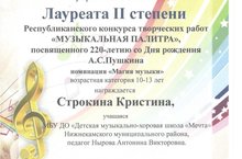 Подведены итоги Республиканского конкурса творческих работ, посвященного 220-летию со дня рождения А.С.Пушкина "Музыкальная палитра". Лауреат II и III степеней стала Строкина Кристина, Лауреатом III и дипломантом I степеней -Алтынбаева Алсу,дипломантом I степени Лукошина Евгения и дипломантом III степени Шеина Елизавета. Девочки участвовали в разных номинациях и добились превосходных результатов. Поздравляем преподавателя Антонину Викторовну Нырову с хорошими достижениями ее воспитанников.