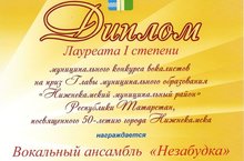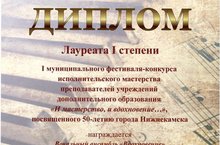 18 мая 2016 года в концертном зале МБУ ДО "ДШИ "Созвездие" вокальный ансамбль преподавателей "Вдохновение" нашей школы приняли участие в I муниципальном фестивале-конкурсе исполнительского мастерства преподавателей учреждений дополнительного образования "И мастерство и водохновение...", посвященного 50-летию г. Нижнекамска и стали Лауреатом I степени.