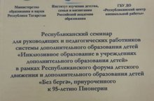 В лицее № 121 Советского района города Казани состоялся Республиканский семинар для руководящих и педагогических работников системы дополнительного образования детей "Инклюзивное образование в учреждениях дополнительного образования детей" в рамках Республиканского фйорума детского движения и дополнительного образования детей "Без бергэ", приуроченного к 95- летию Пионерии.