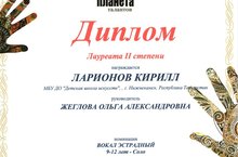 Поздравляем Ларионова Кирилла и его педагога Жеглову Ольгу Александровну с победой в Международном интернет-конкурсе "Планета талантов"!!!