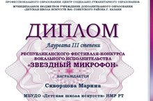 Скворцова Марина һәм Абзалова Ясминне, шулай ук аларның укытучылары Грачева Светлана Николаевнаны бүген Казанда булып узган "Йолдызлы микрофон" Республика фестиваль-бәйгесендә җиңүләре белән котлыйбыз.