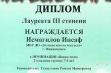 "Беренче адымнар" республикакүләм яшь башкаручылар бәйге-фестивалендә уңышлы гына чыгыш ясап, lll дәрәҗәле лауреат дипломына ия булган укучыбыз Исмәгыйлев Инсафны тәбрик итәбез, алга таба да зур уңышлар теләп калабыз!