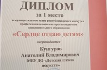Преподаватель Кунгуров Анатолий Владимирович награжден дипломом за 1 место в муниципальном этапе республиканского конкурса профессионального мастерства педагогов дополнительного образования "Сердце отдаю детям". Торжественная церемония состоялась в молодежном центре инициатив "Ковер". Поздравляем Анатолия Владимировича с заслуженной наградой и желаем новых творческих побед и достижений.