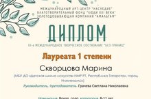 Завершились III Международные творческие состязания "Без границ". По итогам конкурса ученица 2 класса Скворцова Марина (преподаватель Грачева С.Н.) была признана победителем и награждена дипломом лауреата I степени. Поздравляем Марину и ее преподавателя с победой!
