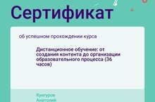 Преподаватель клавишного синтезатора Кунгуров А.В. прошёл курс обучения для педагогов по теме «Дистанционное обучение: от создания контента до организации образовательного процесса». Данный курс организован Академией «Просвещение», созданной одноимённым издательством.Цель курса – дать педагогам максимум необходимой информации для использования продуктов, технологий и интернет-ресурсов при создании цифрового образовательного контента и помочь выстроить процесс взаимодействия с учениками в дистанционном формате.Курс, состоящий из 6 модулей, отличается очень насыщенным содержанием и является практикоориентированным. Большое колличество видеолекций и практических заданий, позволило преподавателю Детской школы искусств узнать немало нового об особенностях построения дистанционного урока и о работе различных образовательных платформ.Наращивание компетенции в виртуальном образовании, по мнению, Анатолия Владимировича - насущная потребность любого современного педагога.По итогам обучения, Кунгуров А.В. получил не только сертификат об успешном прохождении курса, но и большое количество знаний и умений, которыми он планирует незамедлительно воспользоваться в своей педагогической практике. -
