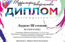Якупов Рамил, класс преподавателя Шадриной Татьяны Владимировны, принял участие во Всероссийском конкурсе искусств "Территория творчества" и стал Лауреатом III степени в номинации"Народные инструменты, соло"! Поздравляем Рамила и желаем ему дальнейших творческих успехов!!!