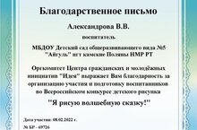 Благодарственным письмом наградили воспитателя - Александрову Валентину Васильевну за организацию участия и подготовку воспитанников к конкурсу!