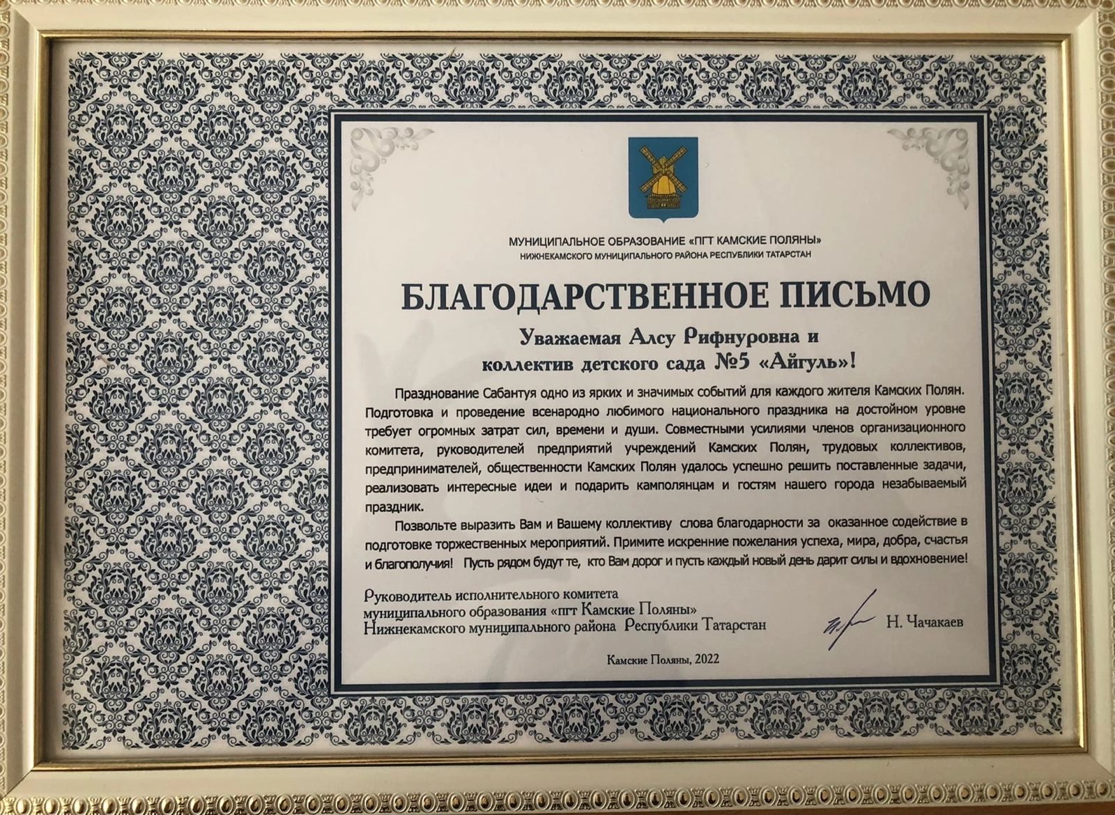 По итогам прошедшего праздника в Камских Полянах «Сабантуй-2022» руководитель исполнительного комитета Николай Чачакаев в торжественной обстановке вручил благодарственные письма руководителям за организацию и проведение всенародно любимого национального праздника.