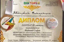 Поздравляем воспитанницу 6 группы Фадееву Софию с победой в V Международном фестивале - конкурсе "Жемчужины Татарстана". София исполнила колыбельную песню и награждена дипломом лауреата 3 степени!