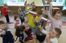 Наши воспитанники конструировали, рисовали триколор, а также раздавали прохожим трёх цветные ленты. -