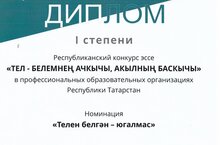 Студентка Галимова Розалинаны һәм аның җитәкчесе Галимова Фәйрүзә Аксановнаны Туган тел турында эссе республика конкурсында I урынны яулаулары белән котлыйбыз! Туган телебезнең татлы ноталарын һәрвакыт истә тотарга, үз тамырларыбыз белән горурланырга, халык байлыгын, туган телне саклап калуда һәм үстерүдә уңышлар телибез.