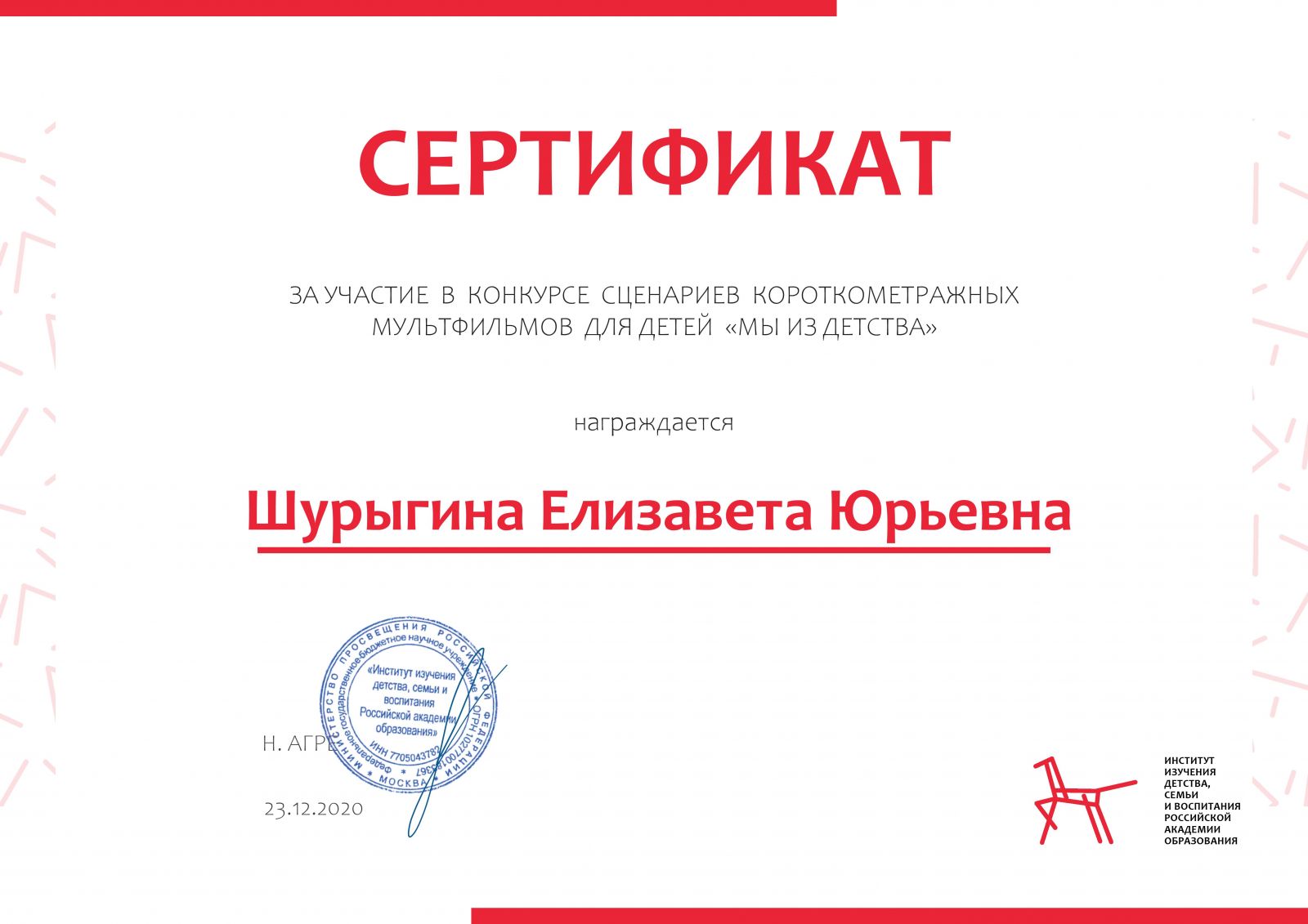 В декабре 2020 года студенты нашего колледжа Шурыгина Елизавета и Никитина Ксения приняли участие в Конкурсе сценариев короткометражных мультфильмов для детей «Мы из детства», который проводился Федеральным государственным бюджетным научным учреждением «Институт изучения детства, семьи и воспитания Российской академии образования». Наши девочки впервые участвовали в таком конкурсе. Формат представленных нами работ был оригинальный сценарий короткометражного мультфильма. Обе студентки получили Сертификаты за участие.