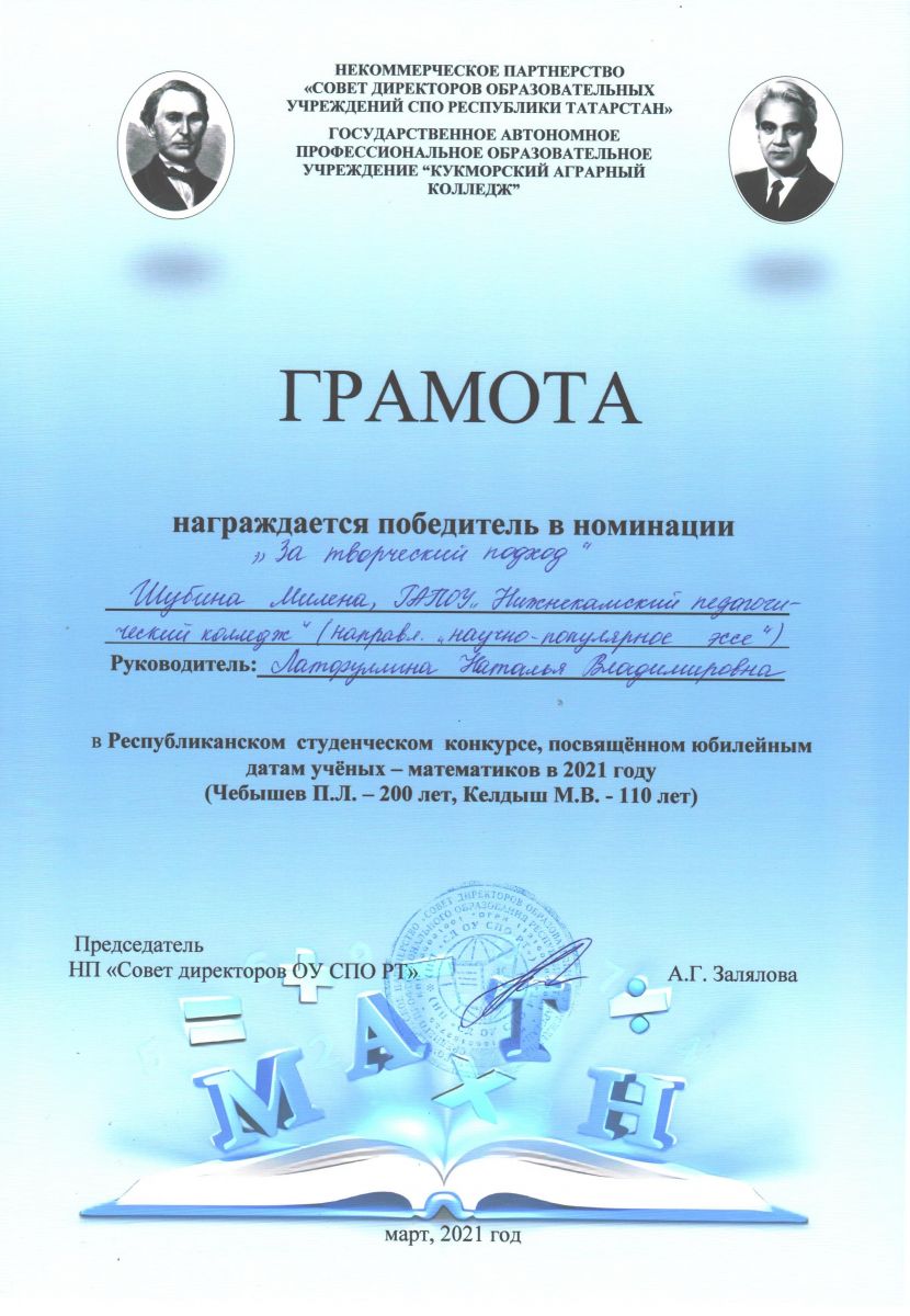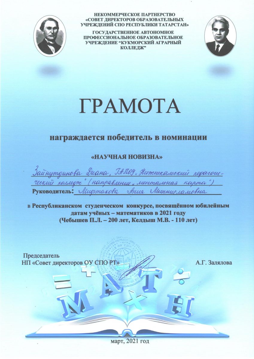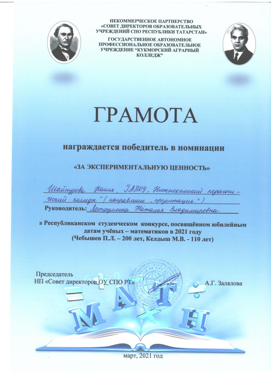 Опубликовано: 12.03.2021Так же 12 марта на базе ГАПОУ «Кукморский аграрный колледж» прошел конкурс среди студентов и преподавателей математики, посвященный юбилейным датам ученых-математиков Чебышева П.Л. и Келдыш М.В. в 2021 году. Шайнурова Наиля и Шубина Милена под руководством преподавателя Латфуллиной Натальи Владимировны стали победителями в номинациях «За экспериментальную ценность» и «За творческий подход» , а Зайнутдтнова Диана под руководством преподавателя Мифтаховой Ании Миниисламовны стала победителем в номинации «Научная новизна».