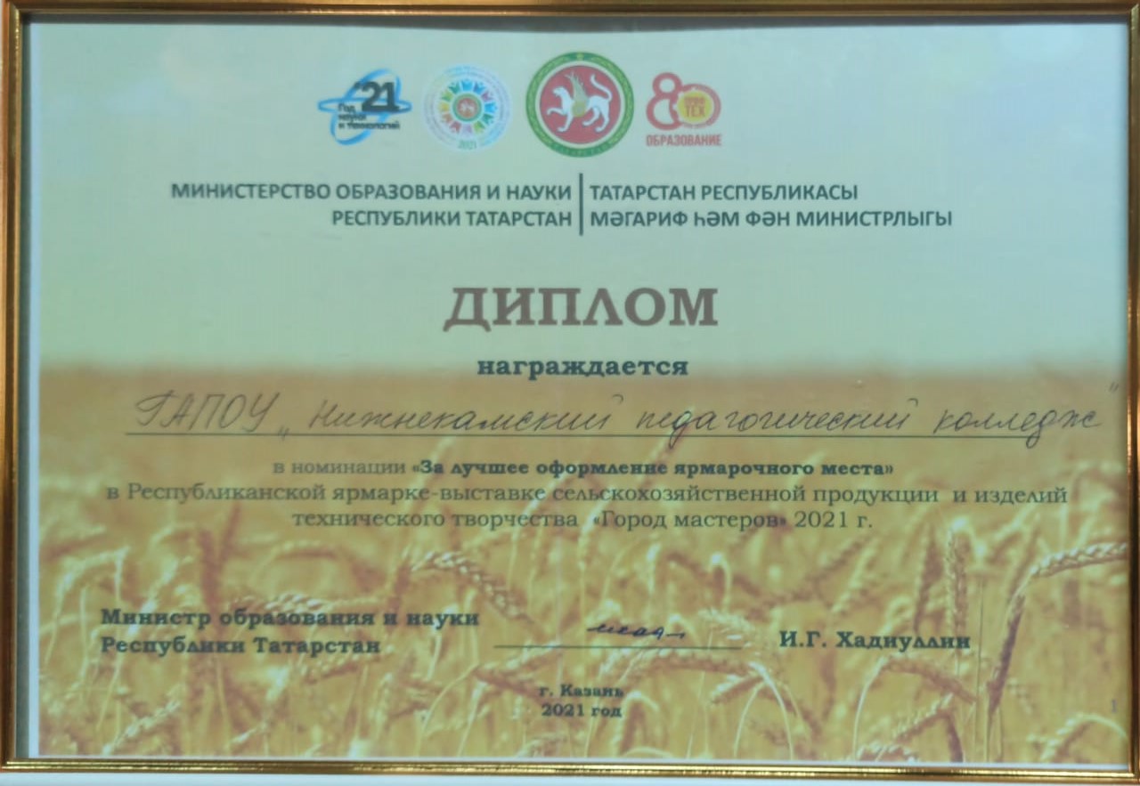 Ярминкә нәтиҗәләре буенча безнең көллият иң югары бүләккә ия булды – бу кубок һәм «Ярминкә урынын иң яхшы оештырган һәмбизәгән өчен»номинациясендә диплом.