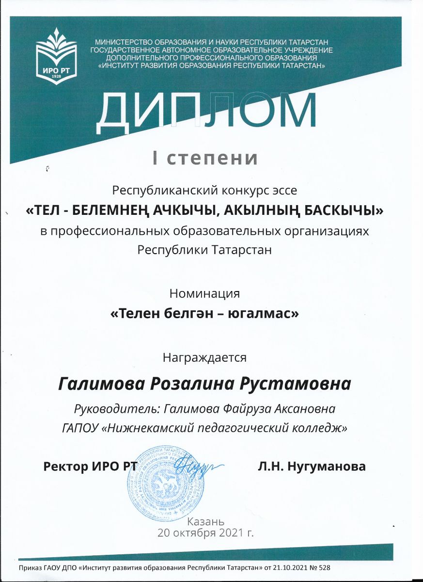 Опубликовано: 29.10.2021Поздравляем студентку Галимову Розалину и ее руководителя Галимову Файрузу Аксановну с победой в республиканском конкурсе эссе о родном языке – I место! Желаем всегда помнить сладкие ноты родной речи, гордиться своими корнями и успехов в сохранении и развитии народного достояния – родного языка.