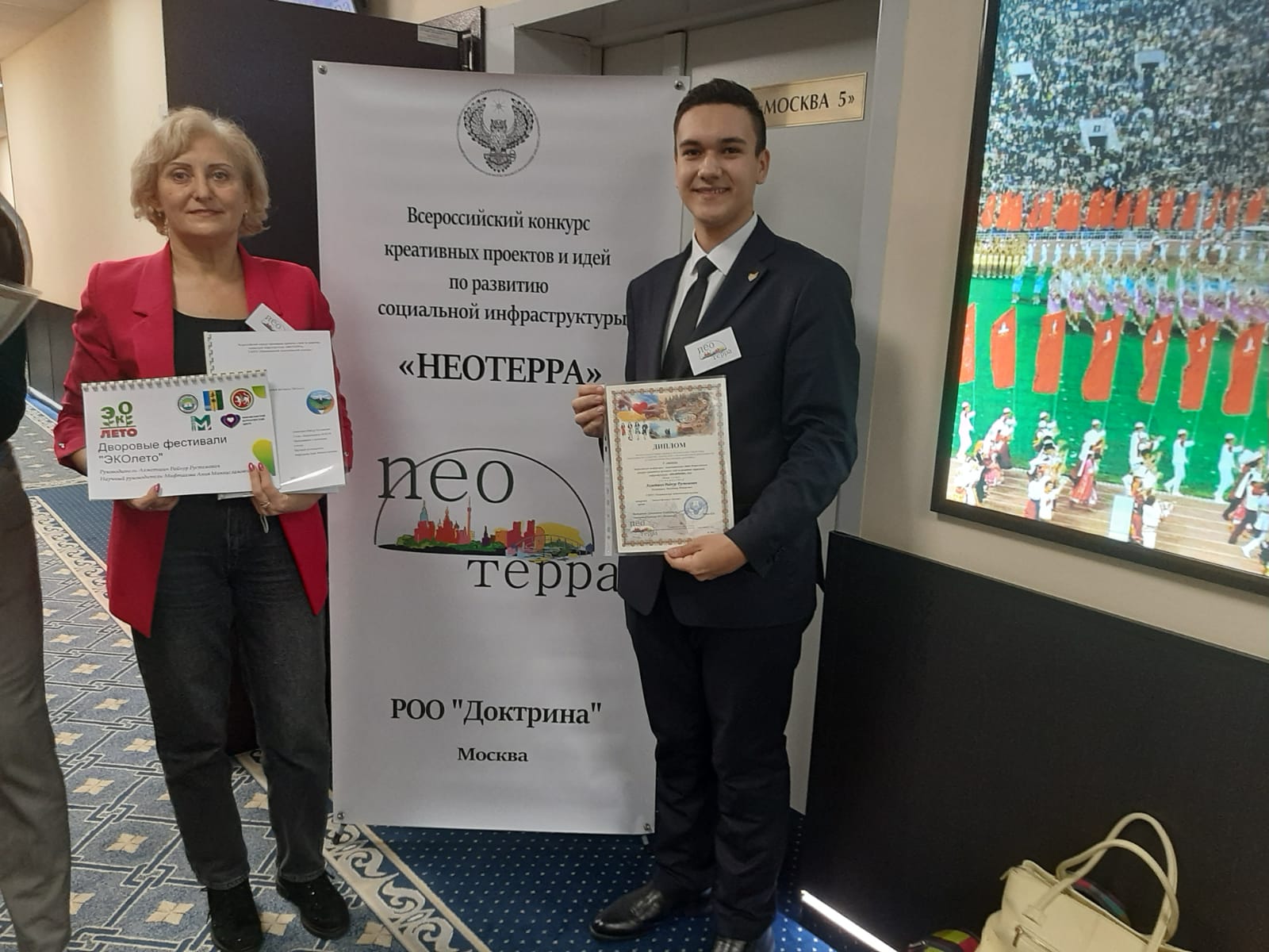 Ахметшин Райнур Рустемович, студент 2 курса ГАПОУ «Нижнекамский педагогический колледж», с научным руководителем Мифтаховой Анией Миннисламовной прошли на очный тур конкурса, который проводился в г.Москве на базе гостиничного комплекса Измайлово. На очном этапе для защиты проекта предусмотрено было 5 минут для защиты и потом задавались вопросы, как участниками конкурса, так и членами жюри. В состав жюри входили: Грачев С.Н. – доцент кафедры Экологии и природопользования географического факультета МГУ; Парфенов К.В. – кандидат политических наук, доцент кафедры государственного и муниципального управления Московского университета; Перевалов А.Н. – кандидат исторических наук, социальный психолог, член лиги практических психологов России; Тымко – Н.В. кандидат педагогических наук, академик Международной академии детско-юношеского туризма и краеведения, которые заранее изучили работы и подготовили вопросы. Работа Райнура удостоилась диплома 1 степени по направлению проектной работы «Общественно-полезная деятельность» с темой проекта «Дворовый фестиваль (ЭКОлето)». Цель проекта заключается в организации волонтеров для обучения детей и подростков новым формам организации досуга в период летних каникул, в теоретическом обосновании и практическом подтверждении эффективности волонтёрской деятельности в экологическом воспитании и проведении различных экологических фестивалей. В дальнейшем планируется продолжение проекта, и надеемся, нас оценят на грантовом конкурсе программы «Формула хороших дел», организованном СИБУРом.