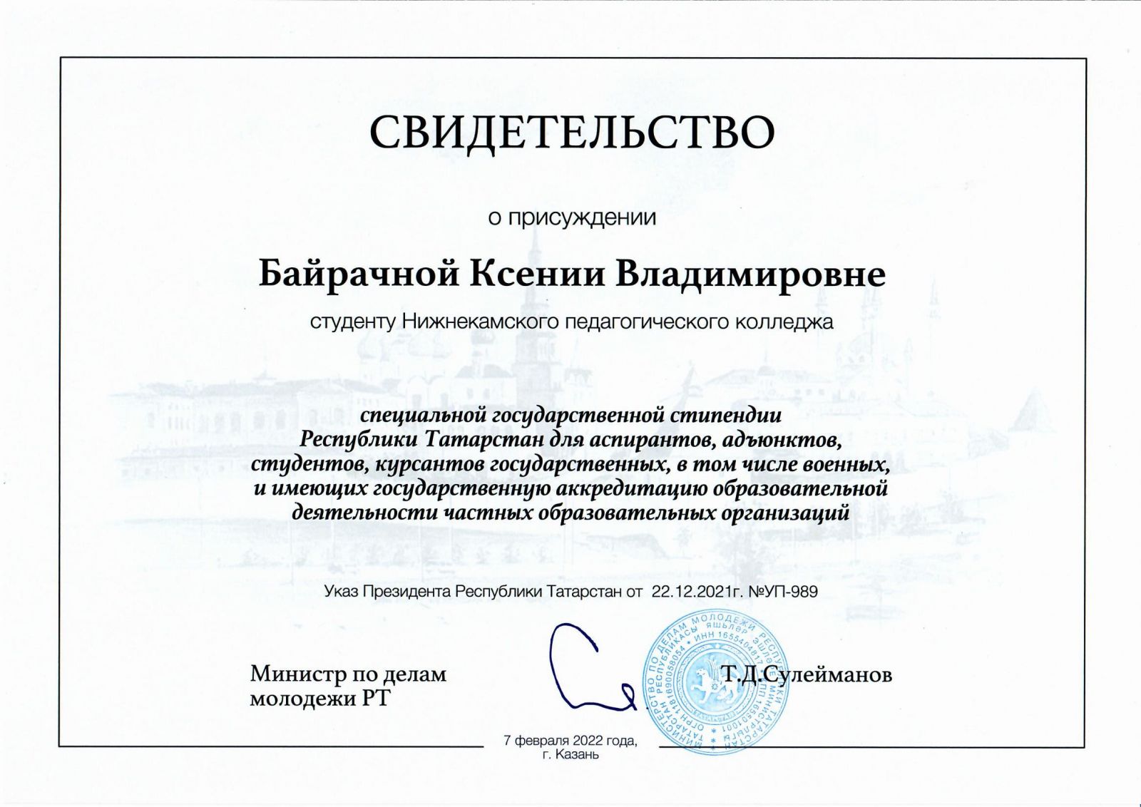 Татарстан Республикасы Президентының «Дәүләт, шул исәптән хәрби, һәм дәүләт аккредитациясенә ия шәхси мәгариф оешмалары аспирантлары, адъюнктлары, студентлары, курсантлары һәм укучылары өчен Татарстан Республикасының махсус дәүләт стипендияләрен билгеләү турында» 22.12.2011 №ПУ-989 Указы нигезендә 2022 елның 7 февралендә Казанда Татарстан Республикасының махсус дәүләт стипендиясе ияләрен хөрмәтләү тантанасы булды.