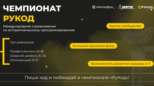 Международный чемпионат по алгоритмическому программированию «РуКод» — это возможность проверить свои знания в области алгоритмов, получить дополнительные баллы на ЕГЭ или усилить своё портфолио, а также побороться за призы. Чтобы присоединиться к соревнованию, подайте заявку на Госуслугах https://www.gosuslugi.ru/landing/RuCode