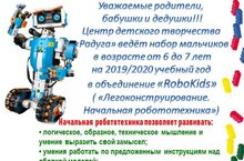 Уважаемые родители, бабушки и дедушки!!! Центр детского творчества «Радуга» ведёт набор мальчиков в возрасте от 6 до 7 лет на 2019/2020 учебный год в объединение «RoboKids» («Легоконструирование. Начальная робототехника»). Спешите, количество мест ограничено! 19.06.2019