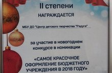 МБУ ДО "Центр детского творчества "Радуга" награждён дипломом 2 степени за участие в новогоднем конкурсе в номинации " Самое красочное оформление бюджетного учреждения в 2018 году" 09.01.2019