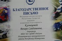 Директор МБУ ДО ЦДТ "Радуга" Кузнецова Венера Сайдашевна награждена Благодарственным письмом Федерации автомотоспорта Республики Татарстан 19.01.2018
