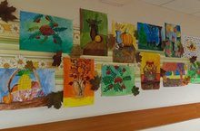 Педагоги Центра детского творчества "Радуга" украсили фойе учреждения детскими рисунками и осенними листьями.