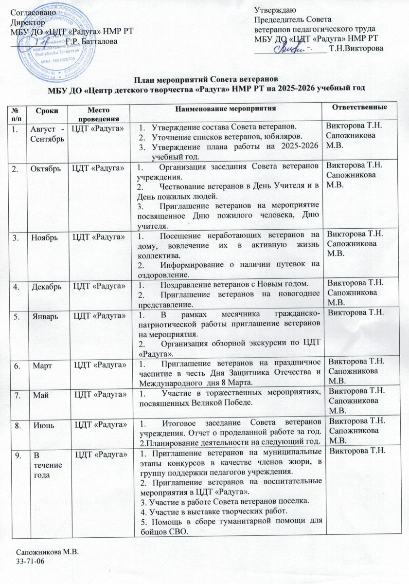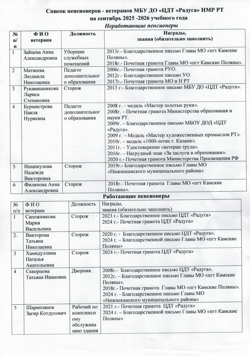 Список пенсионеров-ветеранов МБУ ДО ЦДТ "Радуга" НМР РТ на сентябрь 2025-2026 учебного года