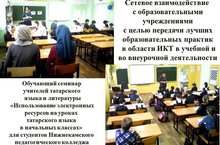 В рамках работы базовой школы по направлению «Сетевое взаимодействие с образовательными учреждениями с целью передачи лучших образовательных практик в области ИКТ в учебной и во внеурочной деятельности» 24 ноября на базе школы № 10 учителя татарского языка и литературы показали открытые уроки и мастер-класс по использованию электронных ресурсов на уроках татарского языка в начальных классах для студентов ГАПОУ «Нижнекамский педагогический колледж».