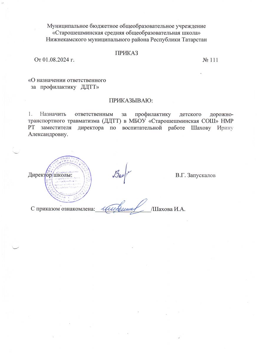 Приказ о назначении ответственного за профилактику ДДТТ.
