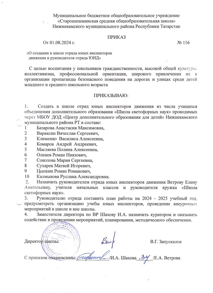Приказ о создании в школе отряда юных инспекторов движения и руководителя отряда ЮИД.