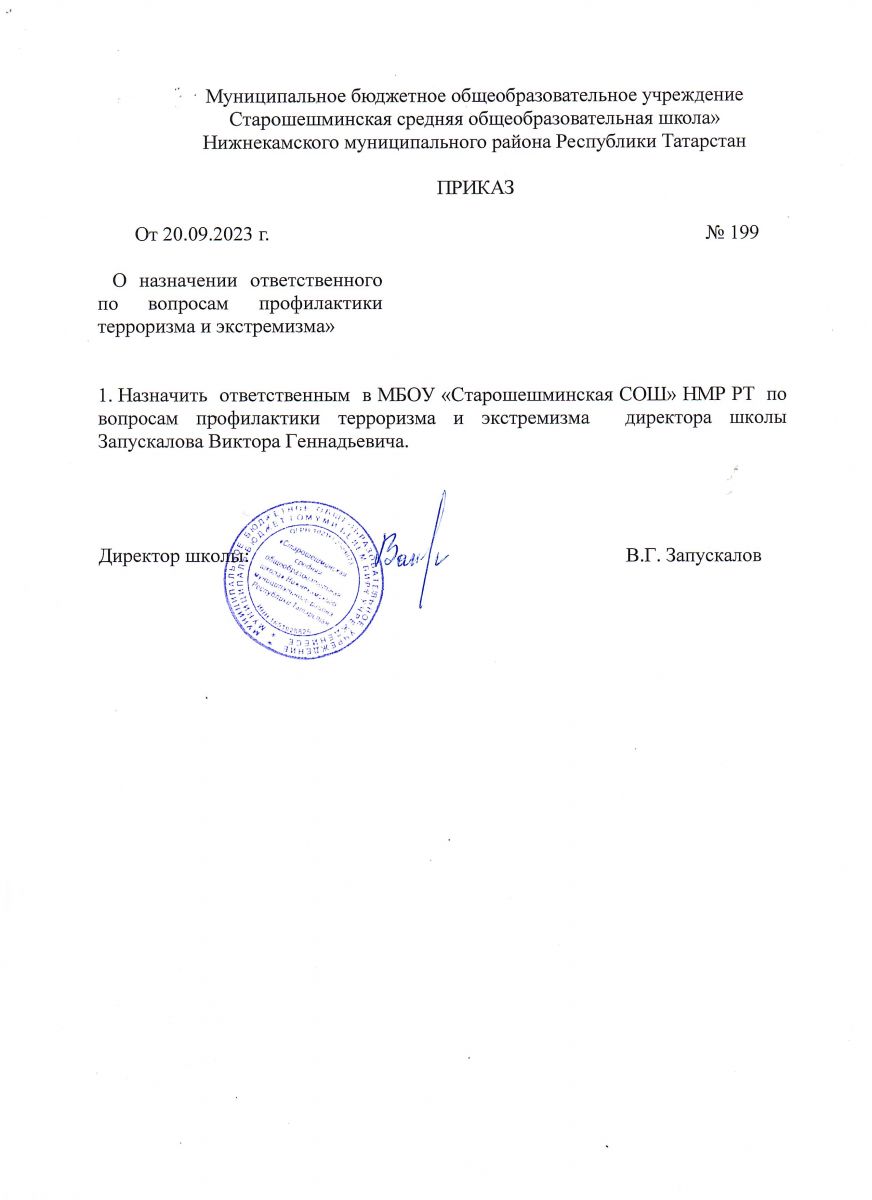 Приказ о назначении ответственного по вопросам профилактики терроризма и экстремизма.