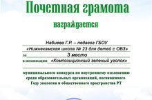 Согласно приказу по итогам муниципального конкурса по внутреннему озеленению среди образовательных организаций №94 от 27.02.2017г. наша школа заняла 3 место, за организацию композиционного уголка «Мы природу не загрязняем, а созидаем!», посвященный Году экологии и общественного пространства в Республики Татарстан. Для зеленого уголка подготовили поделки, панно, топиарии, куклы, картины из бросового материала и вырастили красивые цветы.