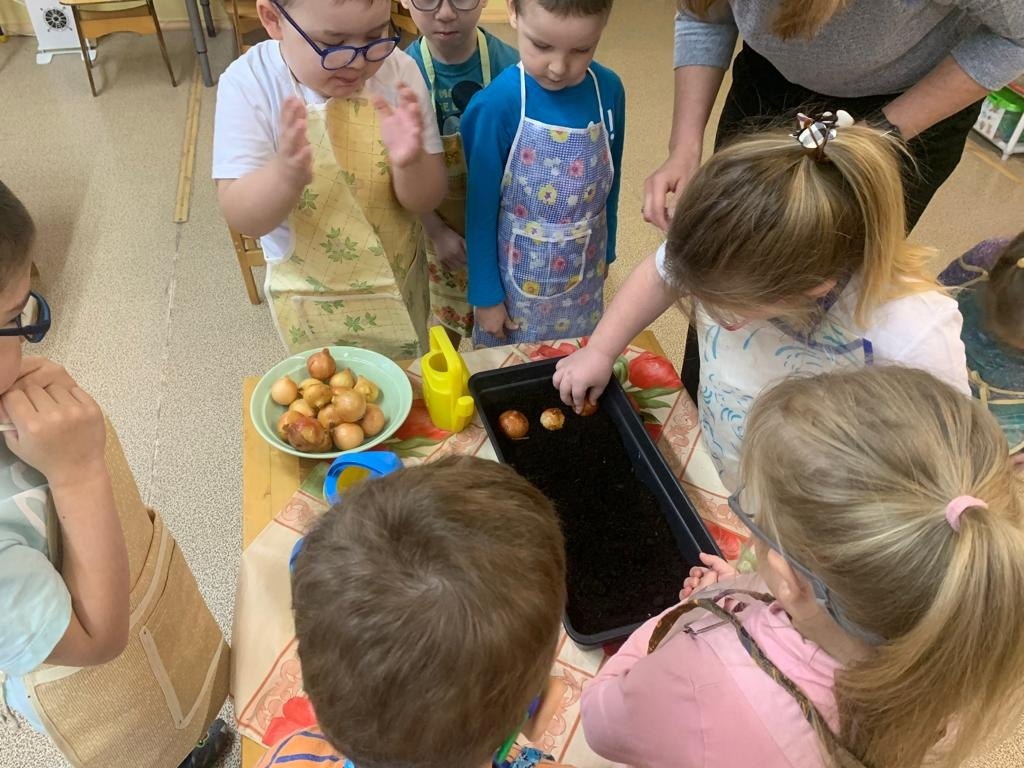 Воспитатель Муртазина Г. Н . вместе с детьми решили вырастить зеленые перья лука . Вместе подготовили землю для посадки, каждый ребёнок сажал луковицу в ячейку специального ящика для рассады с интересом, старательно и аккуратно. После полили водой и нашли подходящее место для луковиц, где тепло и светло. В течении недели ребята наблюдали за ростом лука. -