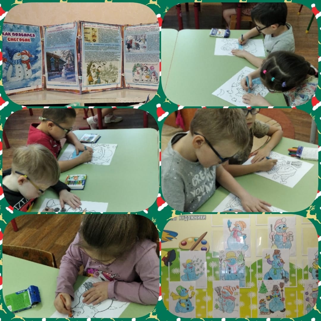дети раскрасили раскраски и устроили выставку детских работ под названием "Весёлый снеговичок". -