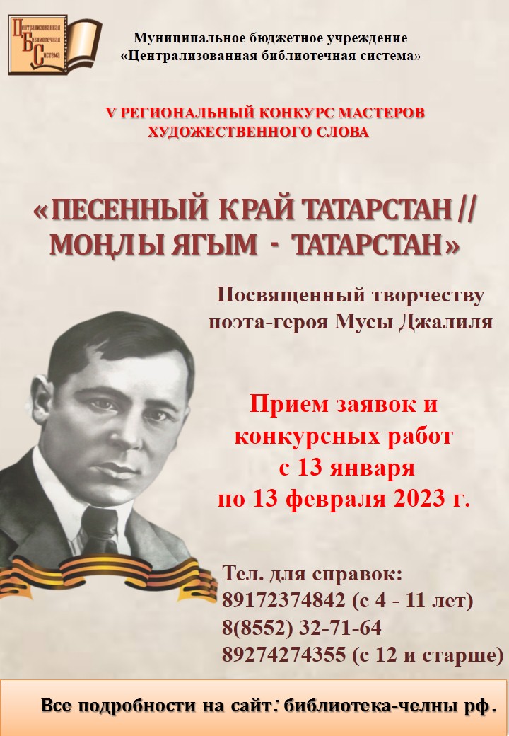С 13 января по 13 февраля 2023 года МБУ «Централизованная библиотечная система» города Набережные Челны приглашает желающих принять участие в V региональном конкурсе «Песенный край – Татарстан//Моңлы ягым – Татарстан», посвященный ко дню рождения татарского поэта и писателя Мусы Джалиля.На Конкурс принимаются видеозаписи выразительного прочтения произведений М.Джалиля и о М.Джалиле, стихи собственного сочинения, рисунки и поделки созданные по произведениям М.Джалиля.Контактная информация: