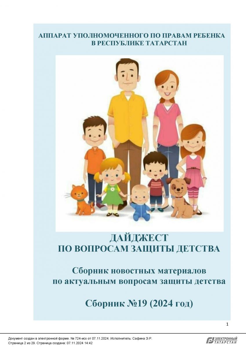 Аппаратом Уполномоченного по правам ребенка в Республике Татарстан подготовлен 19-й выпуск сборника «Дайджест по вопросам защиты детства» в электронном формате.