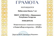 Набиуллина Наиля, ученица 1А класса стала победительницей в Межрегиональном творческом конкурсе "Новогодняя открытка - 2018". Администрация ФГБУ "Заповедная Мордовия" выразила признательность коллективу нашей школы через Благодарственное письмо.