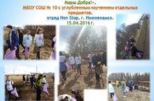 15 апреля 2016 года – «День добрых начинаний» #маршдобра старт этафеты добрых дел республиканской добровольческой акции «Весенняя неделя добра-эстафета добрых дел #ДОБРЫЙТАТАТРСТАН ». В рамках муниципального проекта «Goodpeople» участниками республиканского антинаркотического проекта «Самостоятельные Дети» отрядом «НОН-СТОП» МБОУ «СОШ № 10» г. Нижнекамска было проведено мероприятие – «Марш Добра», на котором ребята очистили дорогу вдоль лесополосы и поляну от мусора у спортивно-оздоровительного комплекса "Батыр".