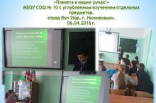 В рамках муниципального проекта «Goodpeople» волонтерами отряда «НОН-СТОП» МБОУ «СОШ № 10» г. Нижнекамска 06.04.2016 года было проведено мероприятие – классные часы «Планета в наших руках», на которых ребята презентовали свои выступления на соответствующие темы. В данном мероприятие приняли участие – 28 человек.