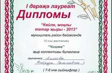 23-26 нче апрельдә Казанда “Тукай варислары” исемендәге III Бөтенроссия нәфис сүз осталары бәйгесенең йомгаклау туры узды. Бу конкурста безнең мәктәптән 4а сыйныф укучысы Нәбиуллина Зәлия катнашты. Аның җитәкчесе Нуруллина Р.Ф. була. Зәлия Сөмбел Гаффарованың “Яшел җиләк болыны” парчасы белән беренче дәрәҗә Дипломга лаек булып, шәһәребезгә зур җиңү яулап кайтты.