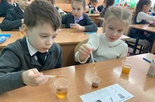 Сегодня в рамках Дня науки учащиеся 10 класса провели мастер-класс для учащихся 1 классов " Определение витамина С в соках". Юные химики и биологи были очень рады окунуться в удивительный мир науки. Первые открытия,первые шаги в исследованиях- улыбки, радость, восхищение царили на практических занятиях.